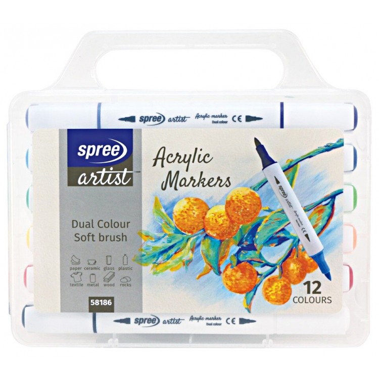 Flomasteriai-markeriai akriliniai 12 sp., teptukiniai, dvipusiai, Spree